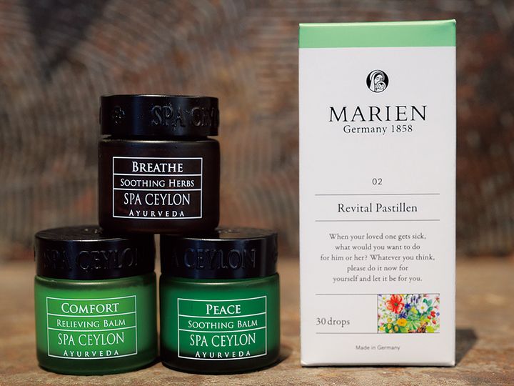 酒井さんの執筆作業のお供、マリエンのハーブドロップと、スパセイロンの3つの商品。よく使うのは首や肩に塗ってリフレッシュするコンフォート バーム。