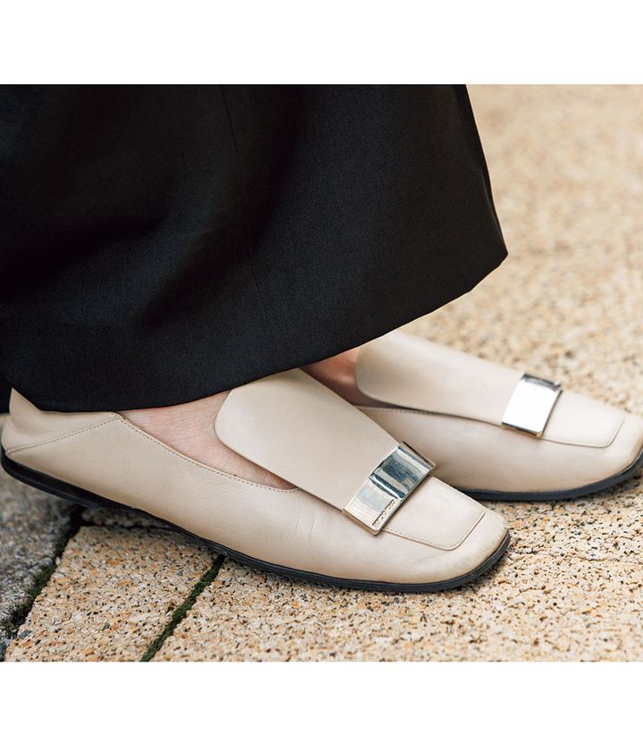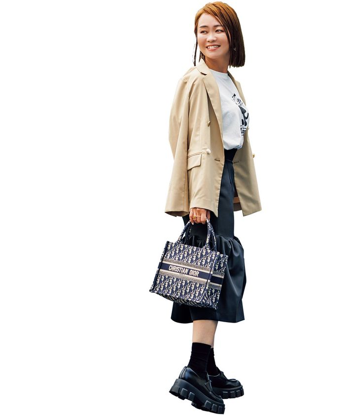 『去年買ったスカートもジャケットを替えるだけで今年っぽくなるし、顔つきがマイルドに見えるところも高ポイント。バッグと靴はかちっとしたもので統一。』