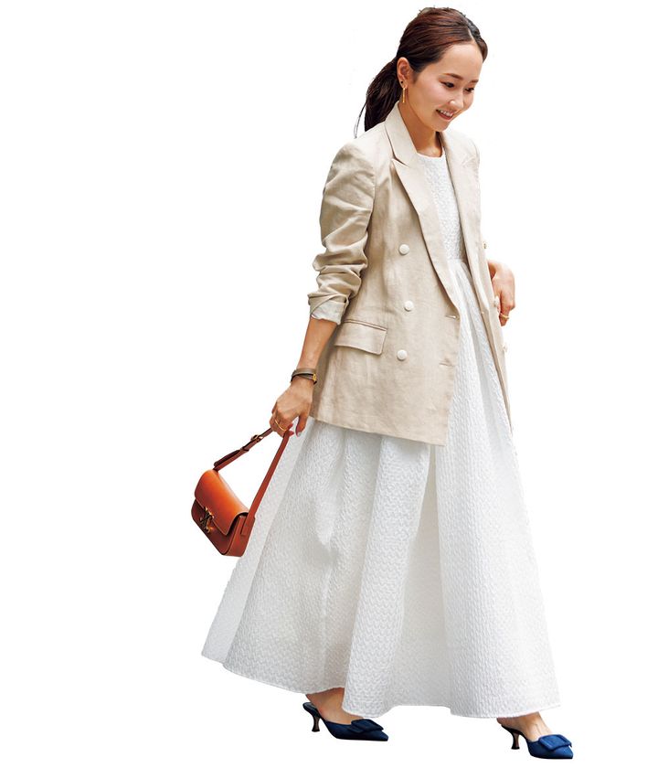 『仕事の商談では、きちんと見せつつ好感度も大切にしたいので、ワンピ×ジャケットが安心。ワンピにボリュームがあるので、袖は捲ってバランスを取ります。』