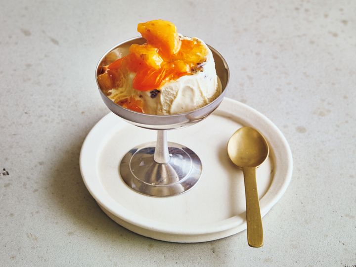 柿1/2個(約50g)は皮をむいて種があれば除き、食べやすい大きさにつぶす。ラムレーズンアイスクリーム1個(約200ml)を器に盛り、柿をのせる。
