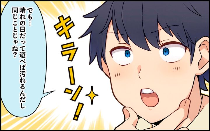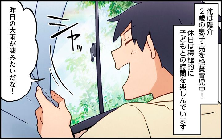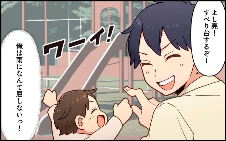 陽介は息子を連れて公園にやってきました。真美が言っていた通り、遊具はびしょ濡れですが…