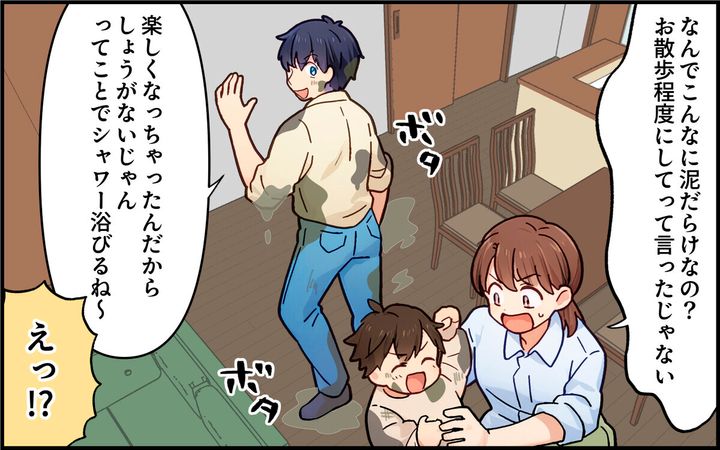 やがて泥だらけになった2人が帰宅し、真美は仰天。