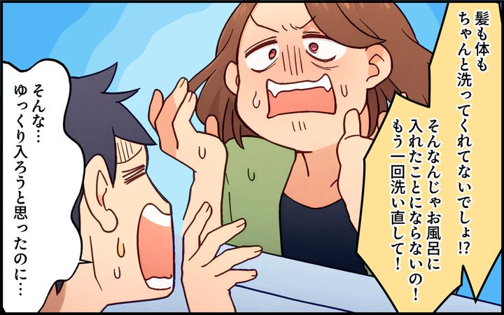 陽介が気持ちよく風呂に浸かっていると、真美が「全然落ちてない!」とものすごい剣幕で入ってきました。