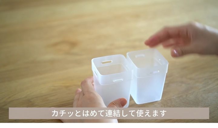 「くつした整理カップ」は、上部に対して下部が少しだけ狭まる四角形のケース。突起を穴にはめ込むことで、前後左右に連結できます。