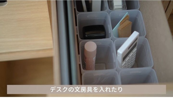 スティックのり、ふせん、スタンプ、テープなど、それぞれ立てておくと、引き出しを開けた瞬間に位置が把握できるように。動画内では小型の電卓も収納していました。