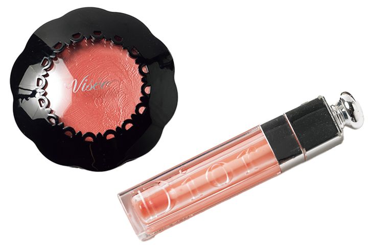 大人可愛く仕上がるヴィセのリップ&チーククリームN BE-5は娘と共有。ナチュラルなツヤ感がよく、リップとして使えるので外出先でも便利。透けるピンクのDior リップマキシマイザー001でちゅるんとした唇に。