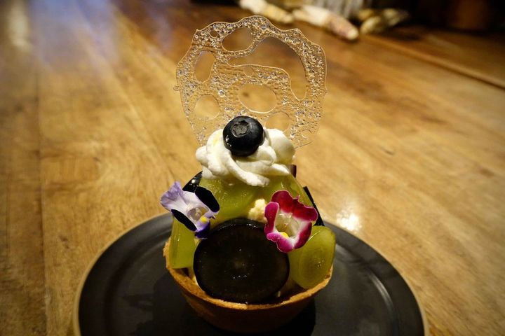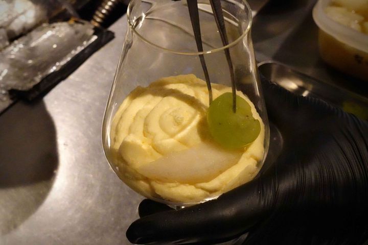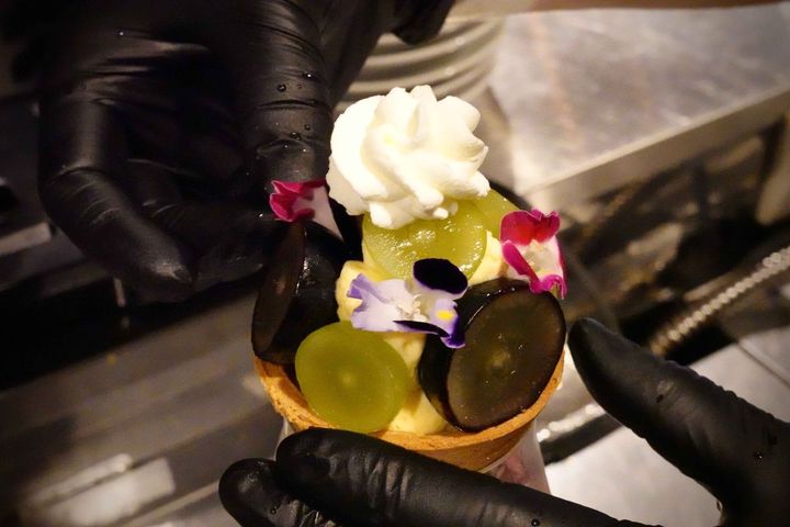 シャインマスカットと和梨に合わせるのは、マスカルポーネのムースやエルダーフラワーのジュレ。後味をスッキリさせるために、一番下にはミントを効かせたブルーベリーカシスソースが隠されています。