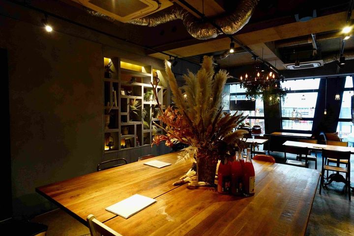 ビルの2階にある当店。エレベーターの扉が開くと、ドライフラワーや緑があちこちにあしらわれたインダストリアルな雰囲気の空間が広がっています。