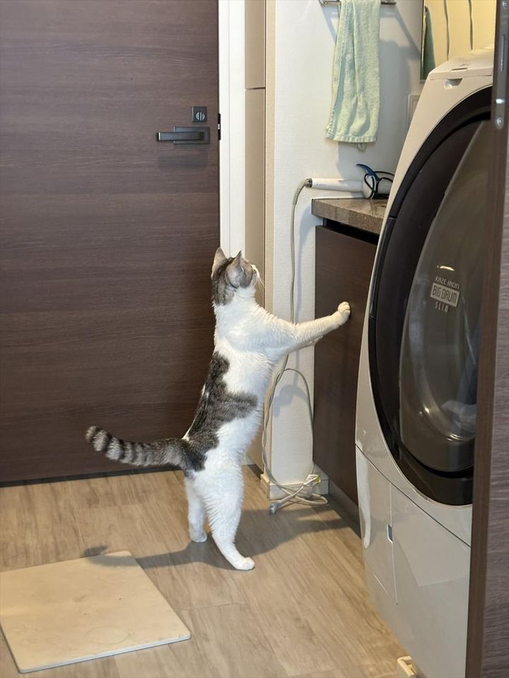 洗面台の前で後ろ足でつかまり立ちをしているのがかわいい姿と思いきや・・・