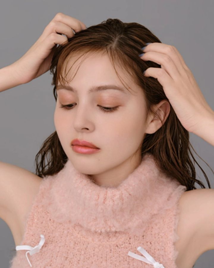 髪全体をラフにミックス巻きしておく。前髪から頭頂部までの髪を、手ぐしで7:3にわける。このとき、前髪の分け目からこぼれ落ちた髪はそのままおくれ毛として残してOK。