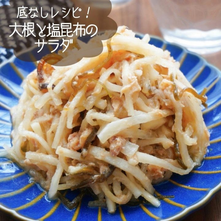 とてもおすすめの大根サラダ。塩昆布を使うので塩もみ不要です◎少し時間を置くと味がなじんで、よりおいしくなりますよ。大根をモリモリ食べられるので大量消費にもぴったりです。