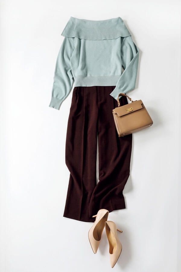 パステルグリーン×ブラウンのチョコミント配色が新鮮。デコルテをきれいに見せてくれる幅広えりのニットは、どんなボトムとも合わせやすくスタメン入り必至。