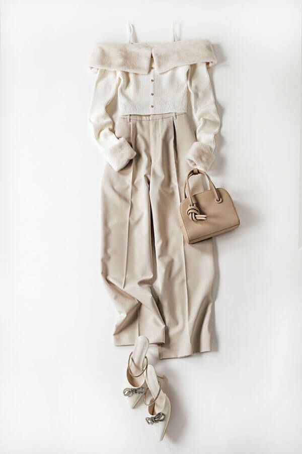 えりと袖口にあしらったふわふわのファーが魅力的。細身のリブニットのコントラストで、女性らしいシルエットをメイク。ボトムや小物を淡いワントーンでそろえることで、ロマンティックな季節を予感させて。
