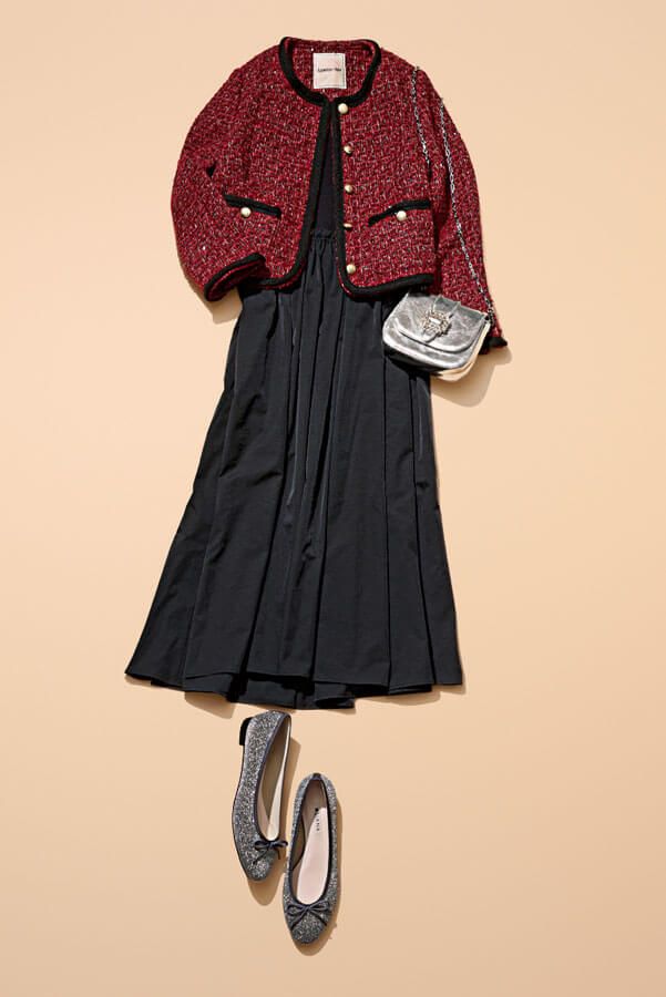 シックなワンピと赤ツイードのおかげで、着こなしのムードが急上昇♡ おでかけスタイルのクラス感を高めて。
