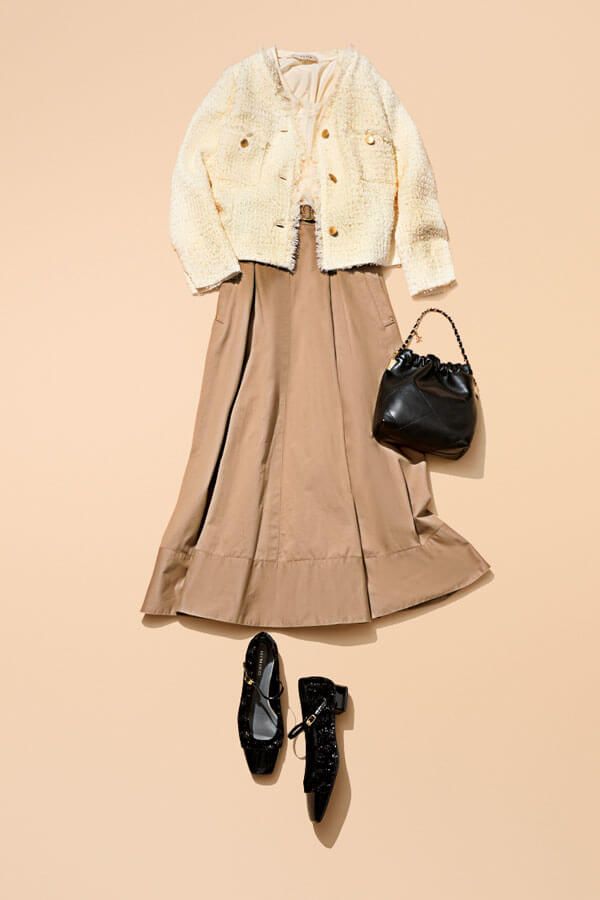 ベージュスカートと合わせたミルクティーコーデで、エレガントなツイードに真新しさを。