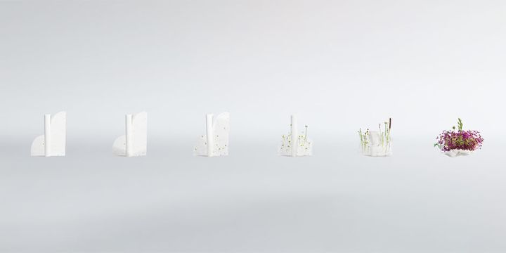 植物の種を含んだ有機的なオブジェは、水を与えることで生命を宿し、種が蕾になり草花が成長していく。