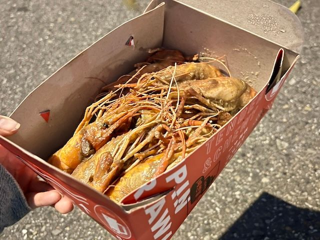 筆者はビールに合うおつまみとして周辺のお店でフードをテイクアウト! 台湾では濃いめの胡椒をまぶした「胡椒エビ」がローカルフード。こちらを購入し、待ちながら今年1年を振り返っていました。