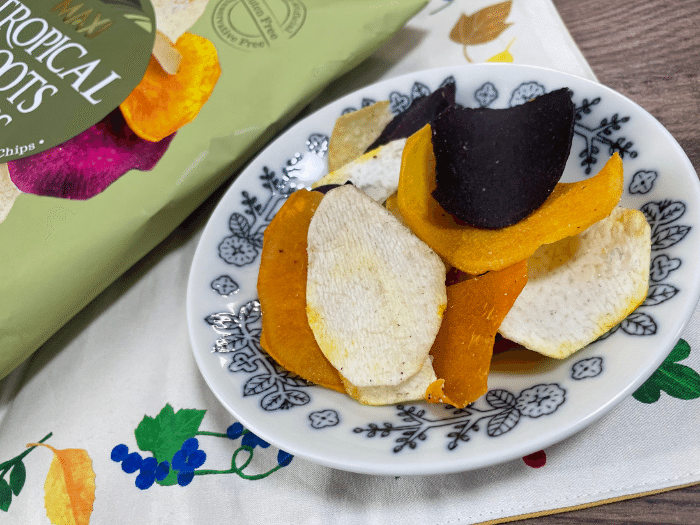 ポテトチップスって、無性に食べたくなるときがありませんか? じゃがいもだけでなく、イモ類ってそういう衝動に駆られやすい食材な気がしています。かつ、チップス系のお菓子って食感がよくて中毒性がありますよね…わたしもだいすきなお菓子のひとつ。今日は、成城石井で見つけた「MAXIトロピカルルーツチップスクラシックシーソルト」というタロイモ・さつまいも・紫いもが使われたチップスをおやつに食べてみました。