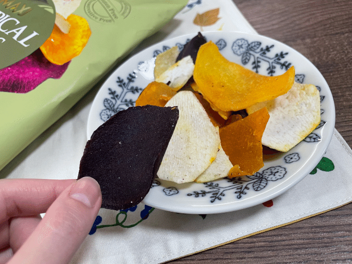白っぽいチップスがタロイモです。タロイモといえば、タピオカの原料というイメージが強かったのですが、味はじゃがいもに近くてクセもなくおいしい! オレンジ色のチップスがさつまいもで、紫色のチップスが紫いもなのですが、こちらは言わずもがなにおいしくて親しみやすい味がします。紫いものほうが若干、口に入れたときの甘みを強く感じ、いちばん歯ごたえがありました。全体を通して、味はとてもシンプル。塩気も控えめなのでナチュラルな味わいが好みの人におすすめです。同じシリーズから、「ローズマリーガーリック」という味も販売されていたので、そちらのほうがパンチがあるかも!? わたしも今度そちらを試してみたいなと思っています。