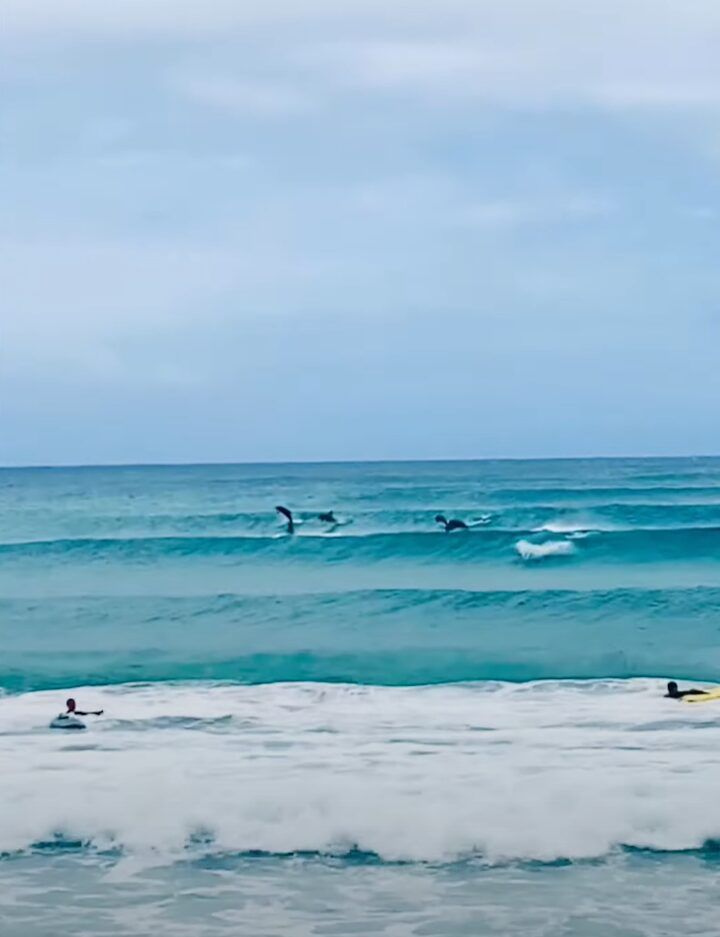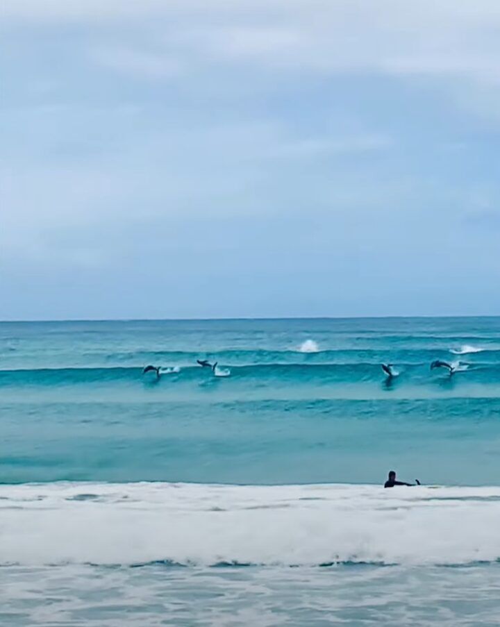 海でサーフィンを楽しむイルカの群れ。 その光景は、こちらの動画からご覧いただけます。