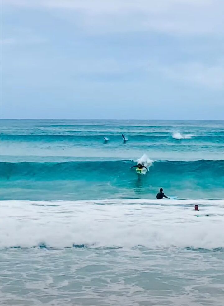 サーファーたちで賑わう海で、波の陰から姿を現したのは・・・