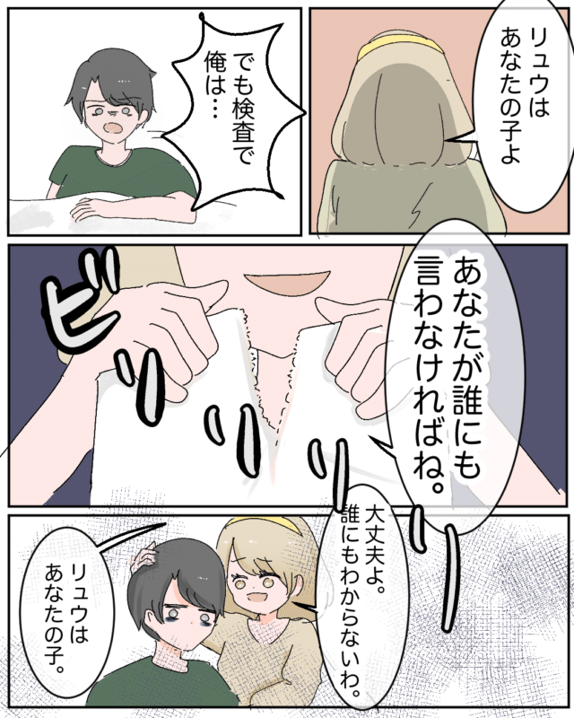 安心させてあげないと。「リュウはあなたの子よ。」「でも、検査で俺は・・。」「大丈夫よ。あなたが誰にも言わなければ。」