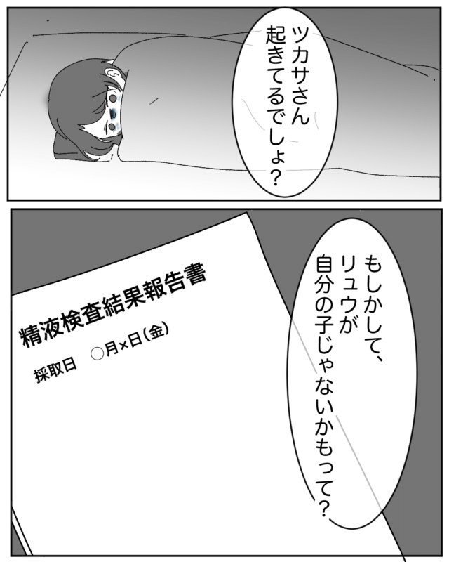 「もしかして。リュウが自分の子どもじゃないかもって?」ツカサさんからは返答がない。とうとうツカサさんは事実を知っちゃったか。カオルさんもこのタイミングでこの結果を送ってくるなんてなかなかやるな。ふふっ。