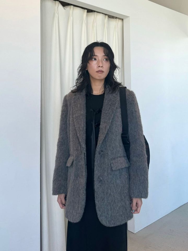 「冬らしいシャギー素材でとても軽やかなジャケットです。オーバーサイズで大人のヌケ感が出しやすく、女性らしく着られるところが◎」ジャケット¥39,600(エミ)