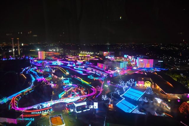 ここで写真を撮るなら噴水ショーが行われる波のプールへ向かう階段からがおすすめ。キャンドルを中心に周辺エリアのイルミネーションを一望できるほか、奥にツイン観覧車を画角に収めることができますよ。