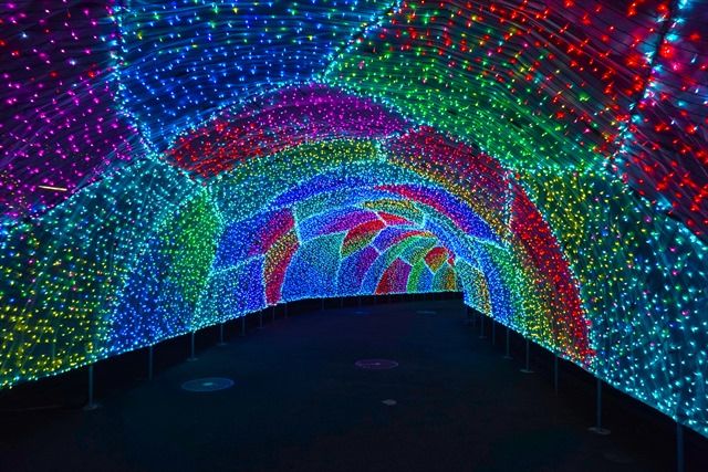 3年ぶりにデザインが一新された、宝石の結晶がモチーフの光のトンネル「クリスタル・パサージュ」。パッチワークのように紡がれたカラフルな輝きが約140mの長さに伸び、フォトスポットとしてもバッチリ。