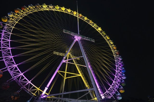 新観覧車「Sky-Go-LAND」はダイヤモンドのブリリアンカットをモチーフにライトップ。ジュエルミネーション開催当初から今までに制作された14種類のジュエリーカラーイルミネーションなどに彩られます。