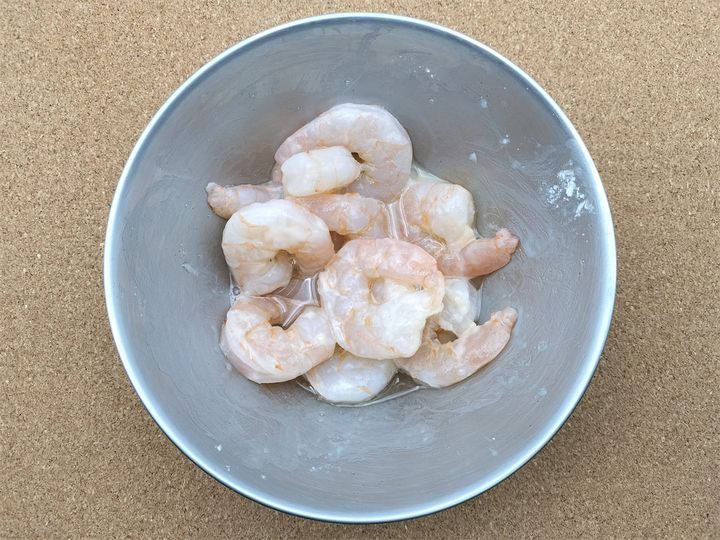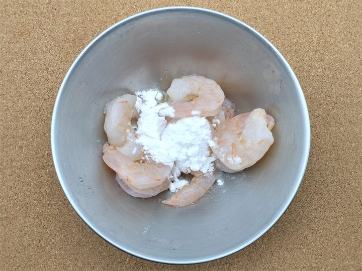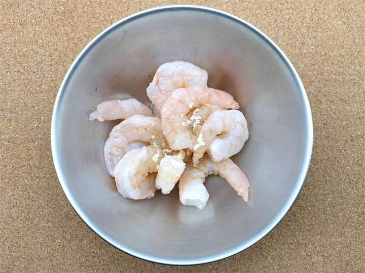 1. むきエビをボウルに入れ、塩、白こしょう、酒を入れてよく揉みます。