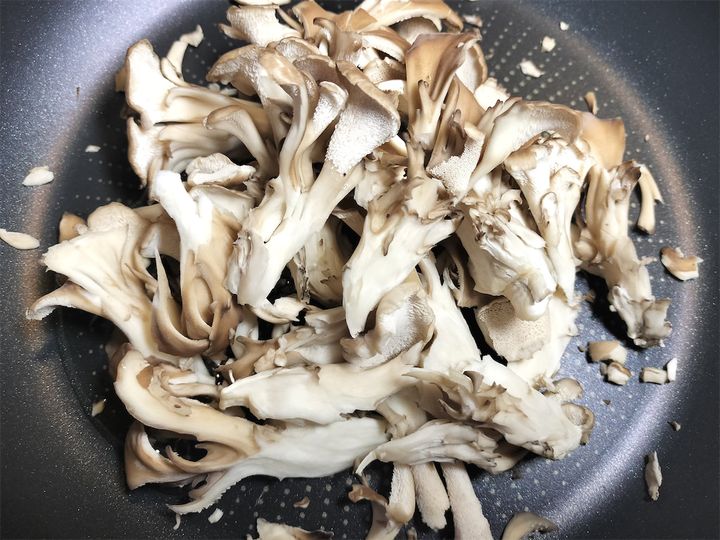5. フライパンにサラダ油大さじ1をひき、中火でまいたけを炒めます。火が入ったらグラタン皿に入れておきます。