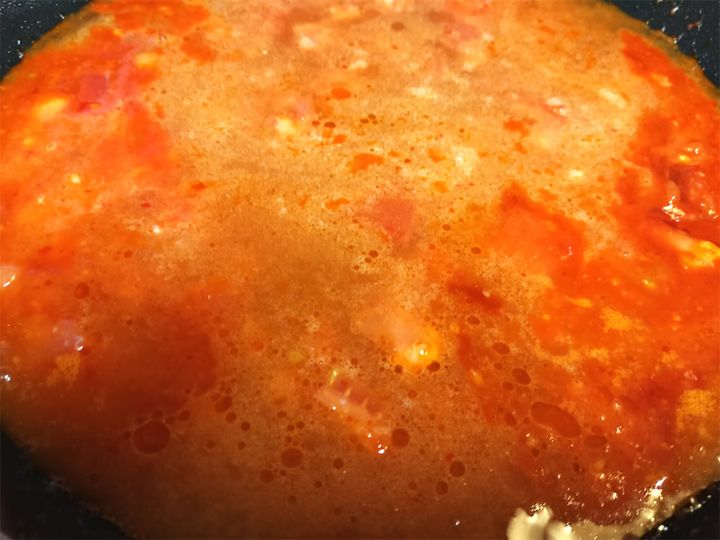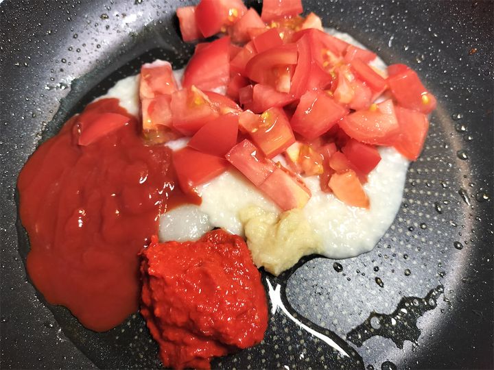 7. フライパンにサラダ油大さじ1をひき、おろしにんにく、おろししょうが、豆板醤、トマトケチャップ、チューニャン、トマトを入れ、中強火にかけます。