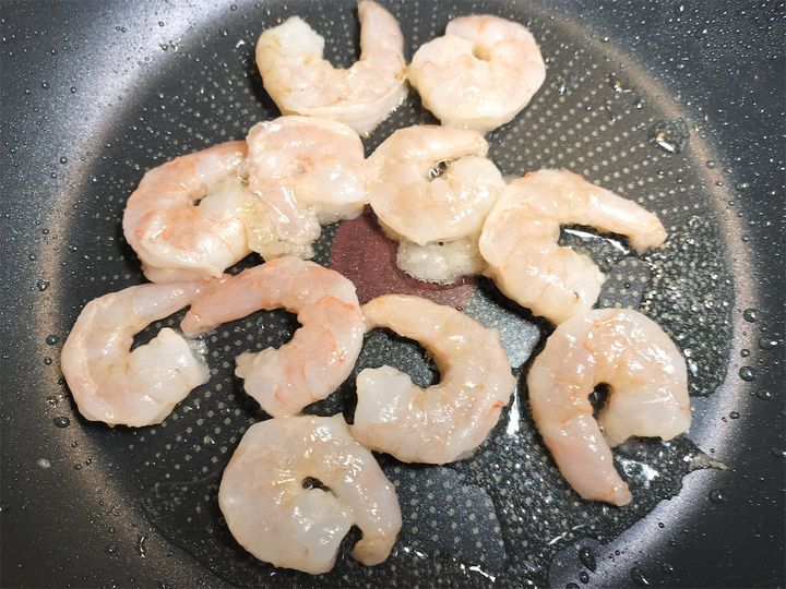 6. 同じフライパンにサラダ油大さじ1をひき、エビを8割方炒めたら皿によけておきます。