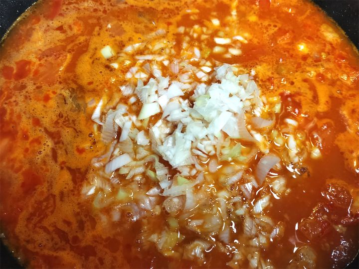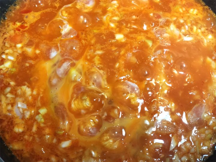 8. 香りが出るまで炒めたら、中華スープを加えます。