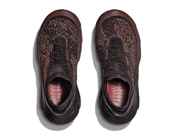 「RESTORE CHUKKA PARIA FARZANEH」は、HOKAの人気アウトドアシューズ「RESTORE TC」をFarzanehのデザインセンスによって再構築した、全く新しいシルエットのモデル。彼女の革新的なデザインアプローチが、HOKAのリカバリーシューズに意外性とダイナミックさをもたらしています。彼女がデザインスタジオの近くにあるベーカリーのお菓子からインスピレーションを得た、遊び心がありつつも洗練されたモチーフがカラーやジャカードモチーフに反映されてます。