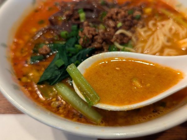ピーナッツの味がしっかりと感じられる担々麺。 普通でもしっかりと辛さが感じられる本格的な味。 辛いけどついついすすってしまうスープは旨味がたっぷり。