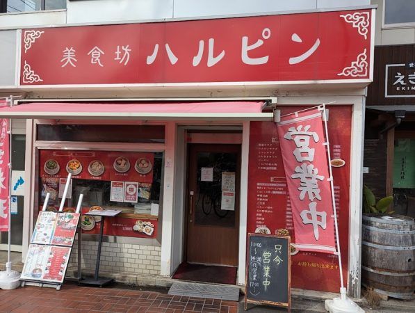 JRの改札口(東側)を出てロータリーを左にキスケ方面に向かいます。 70mほどロータリーを歩くと到着。 赤い看板が目印の「美食坊ハルピン」さん。