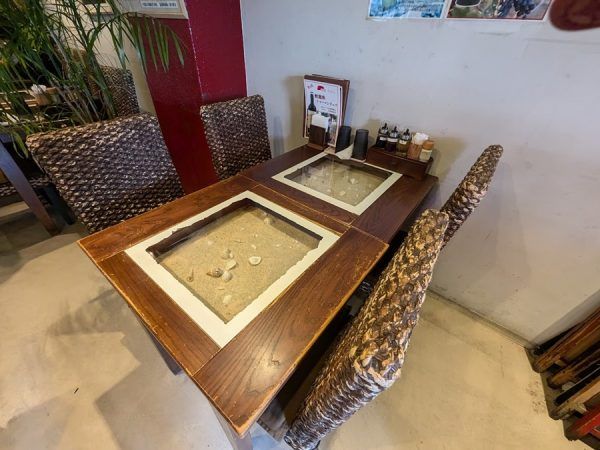 専用の駐車場がないので車での来店の時はコインパークなどをご利用ください。 店内はテーブル席のみですが貝殻が飾られたガラステーブルになっていてお洒落。