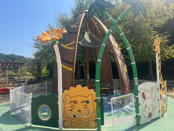 いろんなしかけのある遊具があります。 周囲に柵があるので、安心して見守ることができます。ゴムマットの上で遊ぶことができるので、 転んだ際の衝撃も抑えることができます。 こちらでは、葉っぱや木を集めてお店屋さんごっこ遊びをして楽しみました。