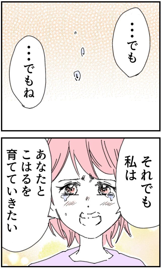 「・・・でも・・・でもね。それでも私はあなたとこはるを育てていきたい」いちろうさんに対して怒りを感じるものの、一緒にこはるちゃんを育てたいという気持ちが勝るかおりさん。