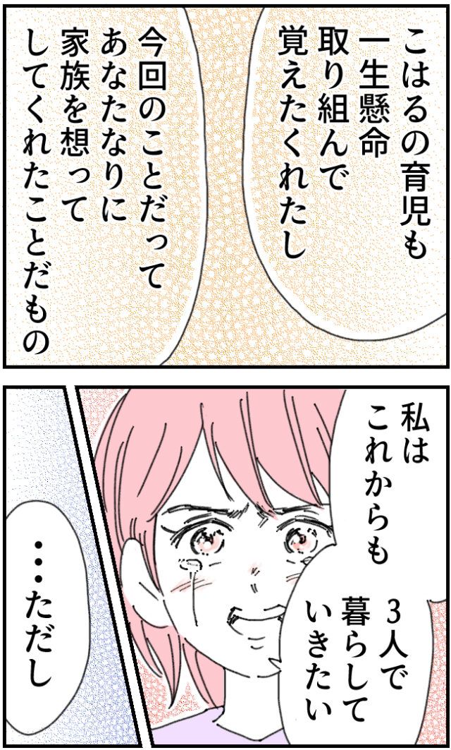 「こはるの育児も一生懸命取り組んで覚えてくれたし、今回のことだってあなたなりに家族を想ってしてくれたことだもの。私はこれからも3人で暮らしていきたい」いちろうさんがかおりさんとこはるちゃんを想う気持ちはしっかりかおりさんに届いていました。しかし、「・・・ただし」かおりさんの言葉にはまだ続きがありました。
