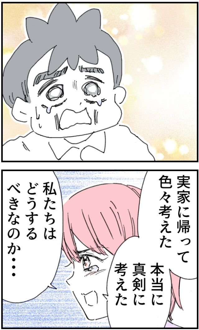 かおりさんの気持ちを聞き涙が溢れるいちろうさん。「実家に帰って色々考えた。本当に真剣に考えた。私たちはどうするべきなのか・・・」別居してからかおりさんはこれからのことをずっと考えていました。