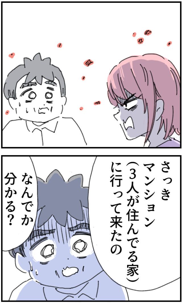 かおりさんはいちろうさんに対する怒りの理由を話し始めました。「さっきマンションに行って来たの。なんでか分かる?」