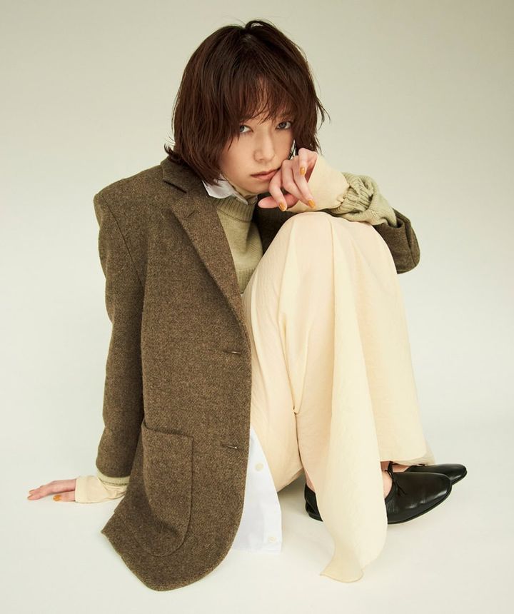 「私、オーセンティックで職人気質なブランドが好きなんです。マーガレット・ハウエルはまさにそんな存在。手織りのハリスツイードから英国トラッドの息吹を感じつつも、どこかリラックスしたナチュラルなムードが魅力のジャケットは、トレンド問わず長く使える。だからこそ“今”を感じさせる着こなしにすることが重要。洗練された色やレイヤリングで、軽やかでモダンな女性らしさをかおらせて」