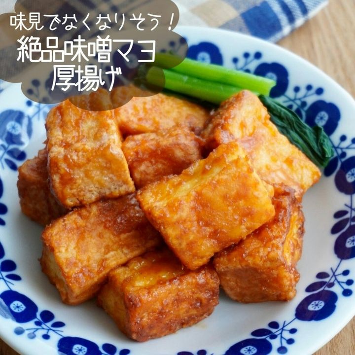 ご飯が進むしっかり味の味噌マヨ厚揚げは、驚くほどおいしいですよ。厚揚げに片栗粉をまぶして揚げ焼きすることで、カリッと食感の厚揚げにタレが絡んで最高です。