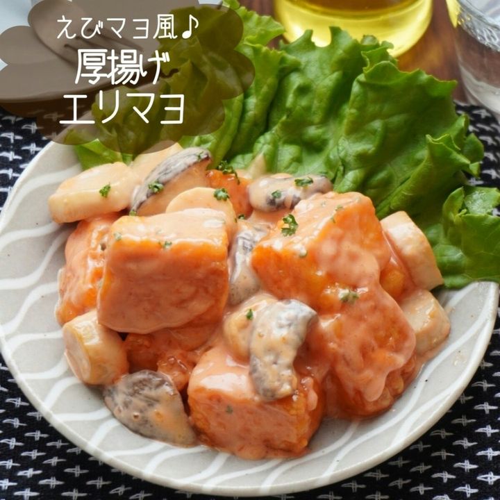 厚揚げとエリンギを使った、まるで「エビマヨ」な「厚揚げエリマヨ」。しっかりとタレが絡んだ厚揚げとコリコリ食感のエリンギがくせになるおいしさですよ。