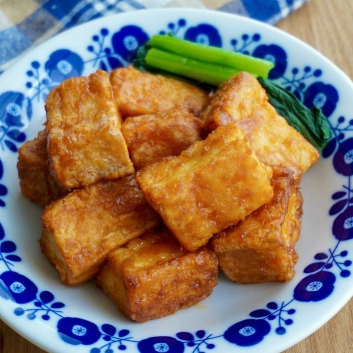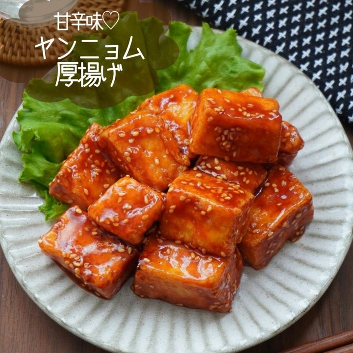 韓国風な味付けのヤンニョム厚揚げ。甘辛い味付けでご飯はもちろん、お酒のおつまみにもぴったり。
