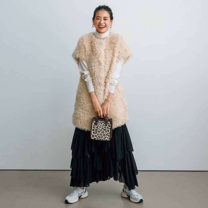 <写真1枚目>ファーコート¥32,450(THINKFUR)ニット¥33,000(スローン/ザ ショップ スローン 新静岡セノバ店)スカート¥36,300(カーサフライン/カーサフライン表参道本店)シューズ¥15,730(ナイキ スポーツウェア/ナイキ カスタマーサービス)ピアス¥22,000(ハイク/ボウルズ)バッグ/スタイリスト私物